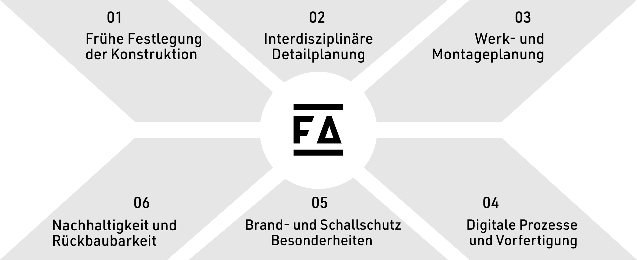Aufgrund des hohen Vorfertigungsgrades im Holzbau ist die erforderliche Detailtiefe deutlich größer als z. B. im Massivbau. Unser integraler Planungsansatz bringt verschiedene Fachleute an einen Tisch: